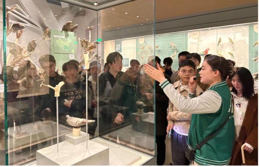 同学们跟随讲解员还参观了“珞珞如石”主展标。“珞珞如石”主展标共分为演化与繁荣、生命与环境、考古与文明、文物与艺术四个部分,共展出近1300件鸟类动物标本、140多件哺乳动物标本以及400余件(套)文物,涵盖了五大生态系统的自然环境,全面展现了我国鸟类的多样性以及地理分布特征。展馆中不仅有“标本唐”唐氏家族存世的数万动物标本,还有考古专业师生挖掘出的珍贵文物,甚至还有南极测绘研究中心的科考队员从极地带回的标本以及广大师生校友和社会名流捐赠的稀有珍品,令人目不暇接、叹为观止。这些展品不仅展现了泱泱华夏历史变迁和文化脉络,也为学员们提供了一次难得的学习机会。