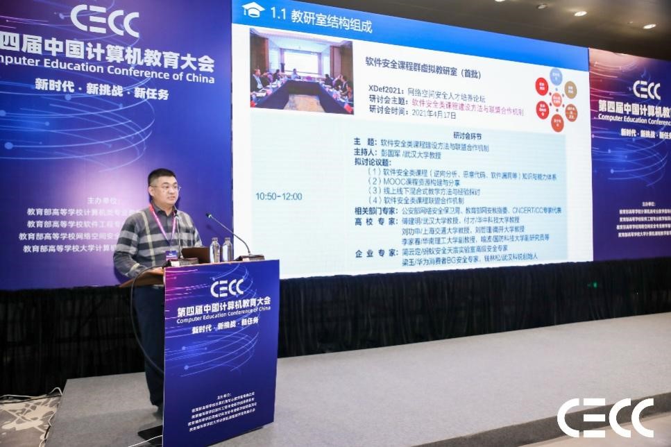 彭国军教授应邀在“虚拟教研室建设”论坛作题为“软件安全课程群虚拟教研室建设探索与思考”的专题报告。2022年,彭国军教授作为牵头人联合上海交通大学、南开大学、西安电子科技大学、信息工程大学、国防科技大学、中国科学技术大学、华中科技大学、四川大学、电子科技大学、华南理工大学、北京电子科技学院11所知名高校和360、奇安信等7家知名企业的29名专家共同申报并获批软件安全课程群教育部虚拟教研室(全国首批),软件安全课程群建设课程包括软件安全、恶意代码、软件漏洞、软件逆向分析、操作系统安全、数字取证等多门课程。