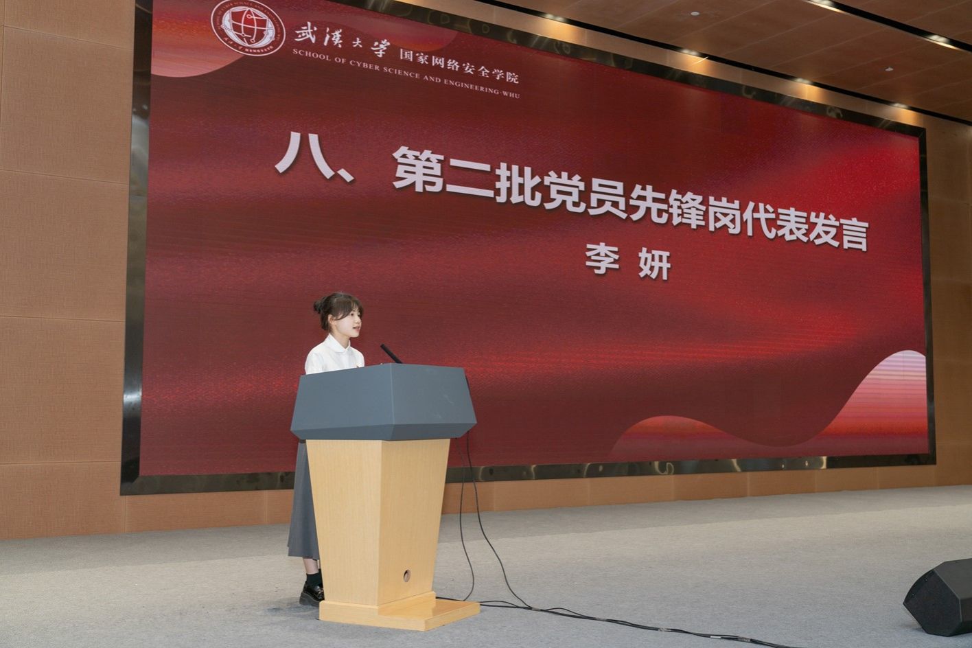2024年党员先锋岗代表李妍同学讲到,“党员先锋岗不仅是一份荣誉,更是一种责任”,她代表全体党员先锋岗同学作出承诺,要立足实干,当好群众的带头人、领路人,做好学院的建设者、贡献者!