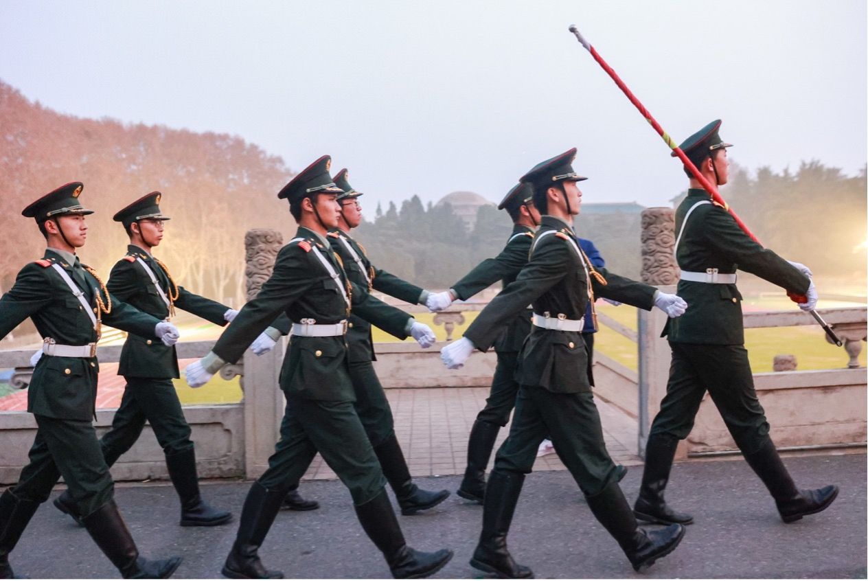上午7时整,升旗仪式正式开始,国旗护卫队迈着铿锵有力、整齐划一的步伐护送国旗来到升旗台前。