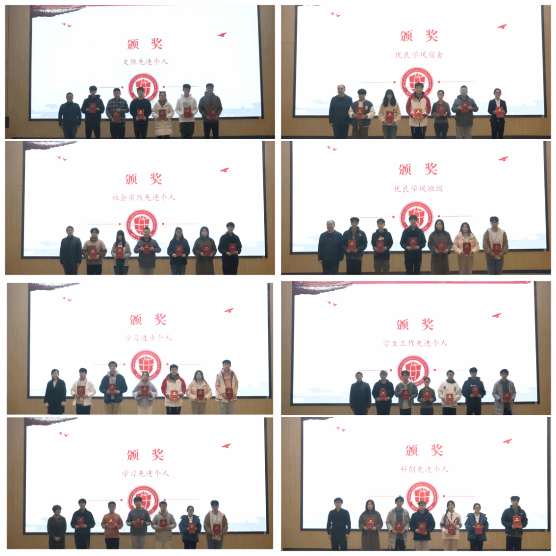第二项,与会老师为“学习先进个人”、“学习进步个人”、“科创先进个人”、“学会工作先进个人”、“文体先进个人”、“社会实践先进个人”、“优良学风班级”和“优良学风宿舍”的获奖代表进行颁奖。