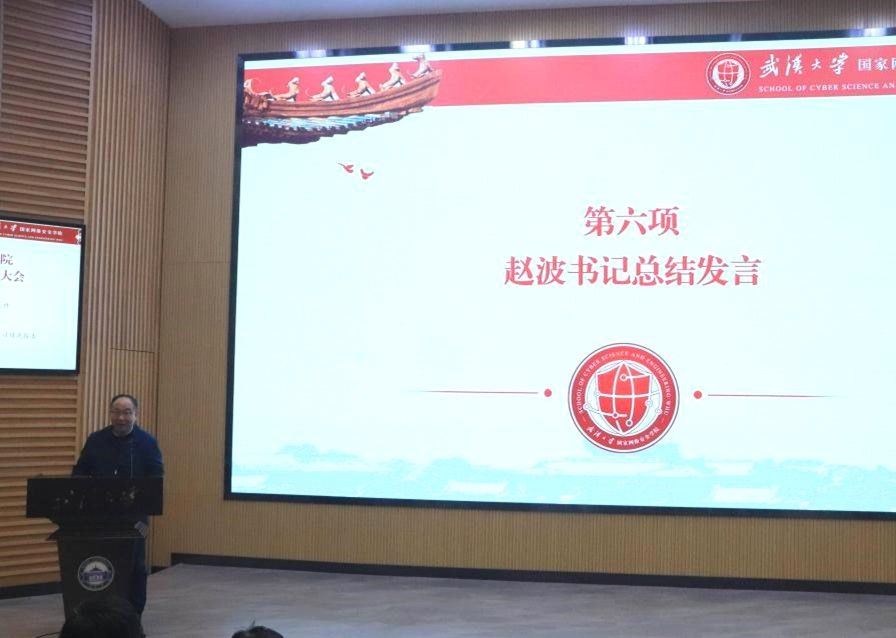 大会第五项,学院党委书记赵波做总结讲话,他向所有获奖的先进集体和个人表示热烈祝贺,向所有辛勤付出的老师们表示衷心感谢。赵书记表示,希望以本次表彰大会为契机,总结经验、凝聚共识,进一步焕发学生工作系统活力,以更加昂扬的姿态迎接新的挑战。最后,赵书记希望同学们能坚定理想信念,胸怀“国之大者”;坚持砥砺奋进,练就过硬本领;坚实自我规划,昂首勇毅前行,努力成为担当“网络强国”建设重任的网安人才。