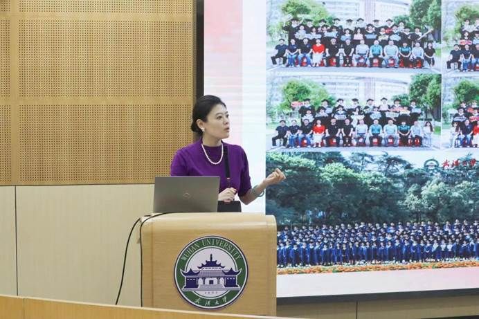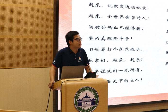 校歌》的播放中走向高潮,大屏幕上班级合照与合影勾起了同学们的大学回忆,求学于武大,相逢于新珈,四年时光承载了同学们的奋斗与拼搏。党委副书记刘嘉梅介绍了两首歌曲的背景和歌词内涵,深情寄语广大党员同学,希望大家珍惜青春韶华、做好表率,“步履不停、奋楫扬帆,相信前路有光,任何时候无惧风浪。”