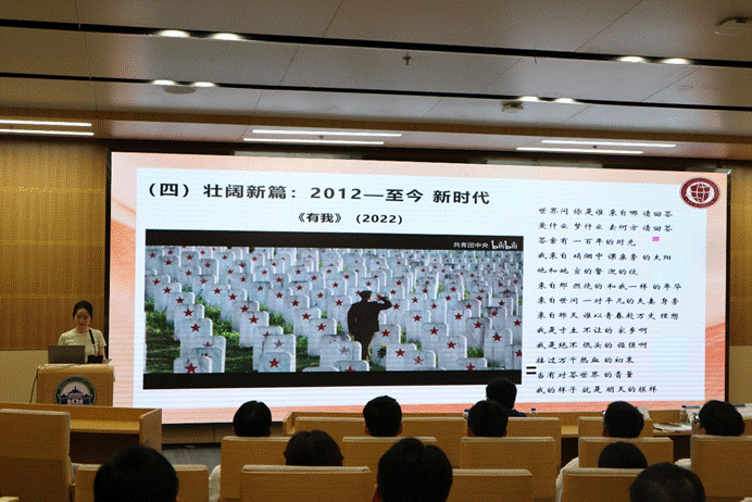 辅导员文贝西结合青年特点,介绍了《我和我的祖国》、《相约一九九八》两首歌曲,歌词朴实而深情,展现了中国特色社会主义在神州大地迸发勃勃生机的样貌。文贝西结合原创歌曲《有我》,展现了一代代不负时代重托的中国青年奋斗历程,希望同学们以先辈为榜样,踔厉奋发、砥砺奋进,肩负新时代中国青年的使命与担当。