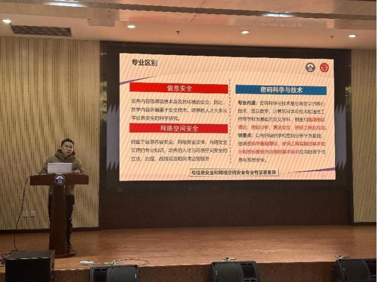 召开了2023级本科生专业分流宣讲会。宣讲会由教学办公室组织,学院副院长赵磊、副书记刘嘉梅、信息安全系主任张立强、网络空间安全系主任曹越、密码系副主任欧长海、学工办及教学办相关老师、2023级全体学生参加了会议。