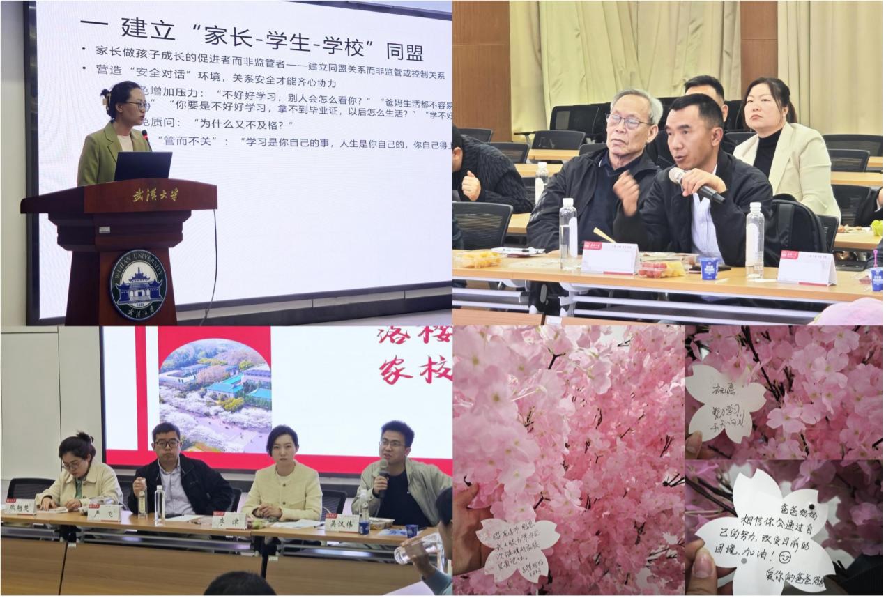 随后,家长代表吴永涛结合自身经历呼吁家长们从“庇护”到“放手”、从“焦虑者”变为“同行者”,希望家校间能够有更明确的互补关系和“预警-响应”机制,进一步托举孩子成长。学生代表穆宣言以《亲爱的爸爸妈妈》家书为载体,深情讲述独立生活的感悟。“那个在机场迷路的男孩,已在樱花树下学会为自己撑伞。”他期待家长从“三餐打卡”转向“成长对话”,分享学习、社团活动中的收获,而不仅仅是关注生活琐事。论坛尾声,家长通过“樱花寄语墙”书写祝福,并在互动环节围绕人工智能带来的挑战与应对、零基础如何适应专业课程等问题深入交流。