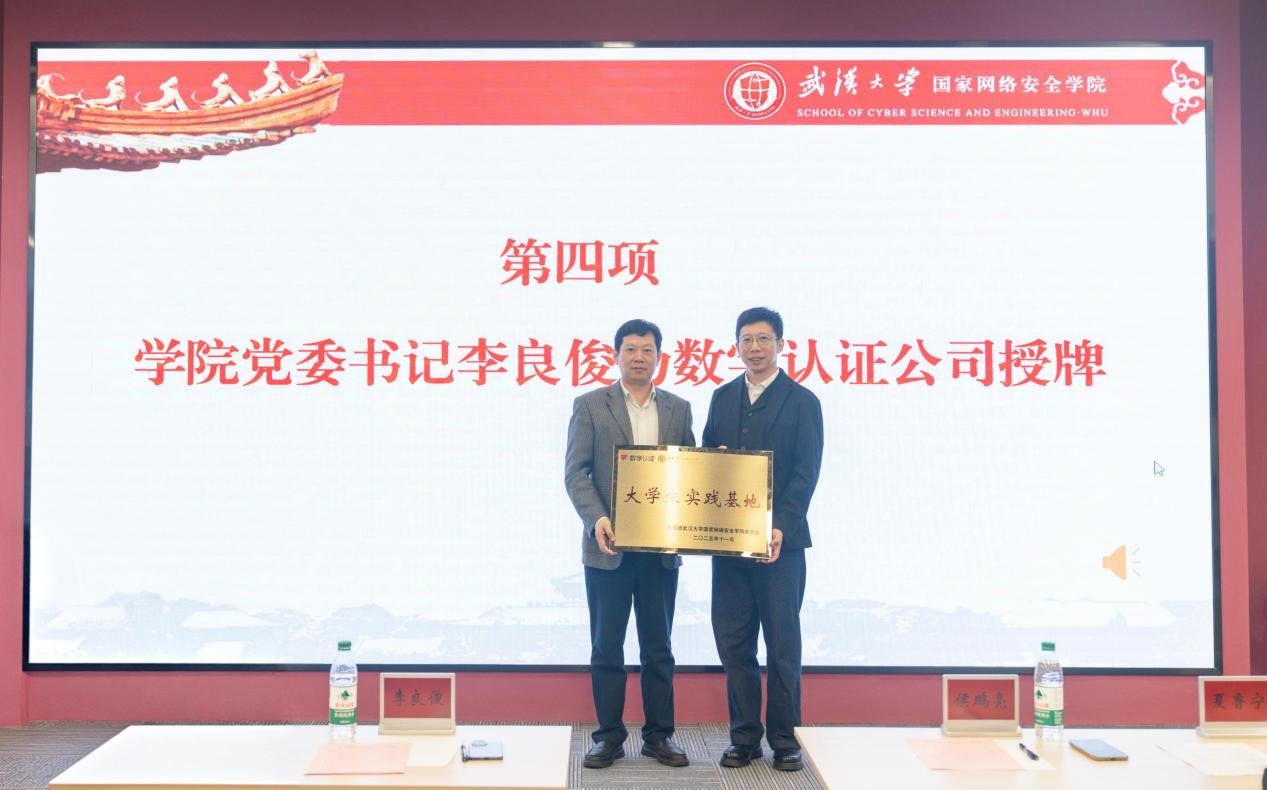 学院党委书记李良俊代表学院向数字认证公司授牌,“大学生实践基地”的设立标志着校企双方在密码人才培养方面的合作进一步深化。