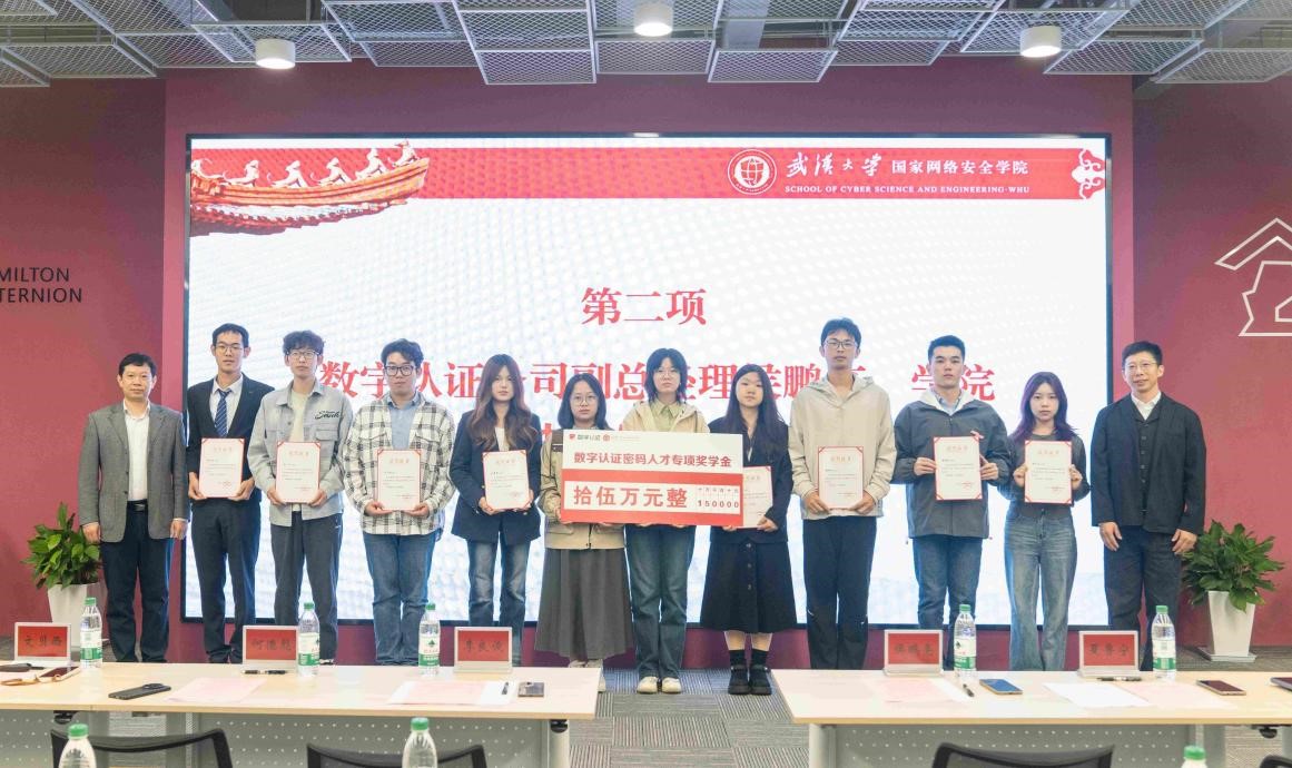 据悉,2025年学院与数字认证公司签订协议设立“数字认证密码人才专项奖学金”,共计15万元,分三年发放,每年5万元,专项用于激励密码专业本科学生。未来,学院与数字认证公司将继续加强合作,携手为我国密码事业培养更多高素质、复合型专业人才。