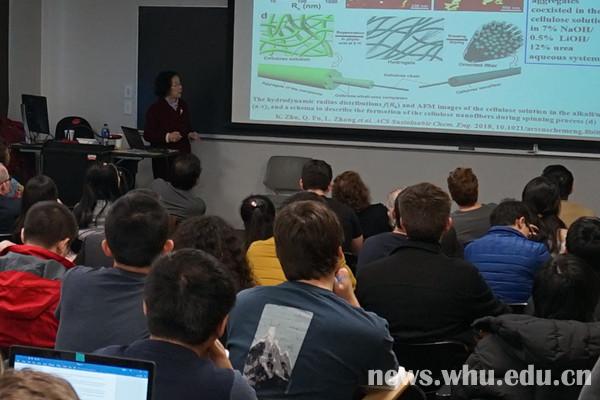 在密苏里大学堪萨斯分校,张俐娜作了题为“纤维素和甲壳素构建生物医用材料”的学术报告,百余名师生到会聆听。听完报告后,该大学化学系主任Kathleen Kilway教授对张俐娜所做的工作给予了高度评价。随后,该校彭中华、叶水清教授与张俐娜进行进一步学术交流。