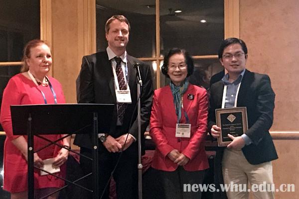 ▲美国化学会纤维素分会主席Steve Eichhom教授(左2)、颁奖主席Monica Ek教授(左1)、张俐娜(右2)和胡良兵(右1)在主席台合影