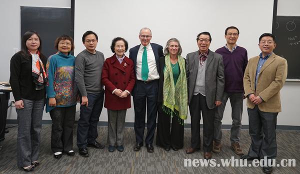 ▲张俐娜(左4)、杜予民(右3)与马里兰大学教授Gregory Payne(左5)、胡良兵(左3)和李腾(右1)等合影