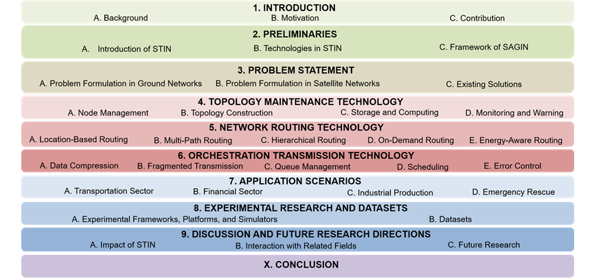 该工作从网络层的视角全面综述了6G星地融合网络的最新研究进展,深入梳理了近年来相关领域的140余篇研究论文。论文依据网络服务流,将星地融合网络核心技术划分为三大类,包括拓扑维护技术、网络路由技术与编排传输技术。同时,该工作梳理了星地融合网络领域的既有综述文献,并对其研究内容进行了分类与分布特征分析。论文深入剖析了卫星网络架构与地面网络架构面临的核心技术挑战及现有解决方案,特别是动态拓扑、异构互联、资源协同等多个关键维度进行归类与分析。