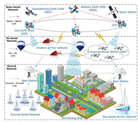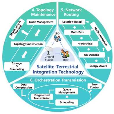 此外,该工作系统性审视了星地融合网络在多个领域的应用实践,详细介绍了相关的系统框架、运维平台、模拟仿真工具及数据集。论文进一步探讨了星地融合技术的当前研究热点与未来趋势,尤其聚焦于网络层的创新性探索方向,如星上智能处理、空天地海一体化组网、人工智能驱动的网络自治等。