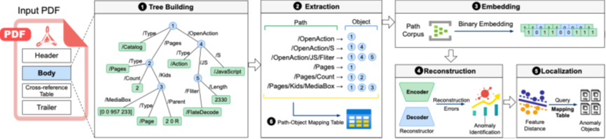 恶意PDF文件是现代网络安全领域中普遍存在的威胁,常被用作网络钓鱼活动和其他Web应用程序攻击的攻击载体。尽管机器学习在恶意软件检测方面取得了进展.,但现有的PDF分类器易容易被对抗样本绕过,且不具备恶意区域定位功能。该论文提出了VAPD,一种基于编码器——解码器架构的异常检测模型,具有双重取证目标:1)检测PDF恶意软件;2)定位PDF恶意软件中的异常区域。该论文在多个数据集上对VAPD进行了评估,包括现实世界中的高级持续性威胁样本,其准确率达到99.54%。在特征空间和样本空间中的四种对抗攻击方法下,VAPD表现出了优异的鲁棒性,综合性能优于现有的基线检测方法。此外,VAPD还具备异常区域的定位功能,能够自动输出可疑对象,能够帮助安全分析人员快速响应并指定对策,这是其他研究均不具备的分析功能。