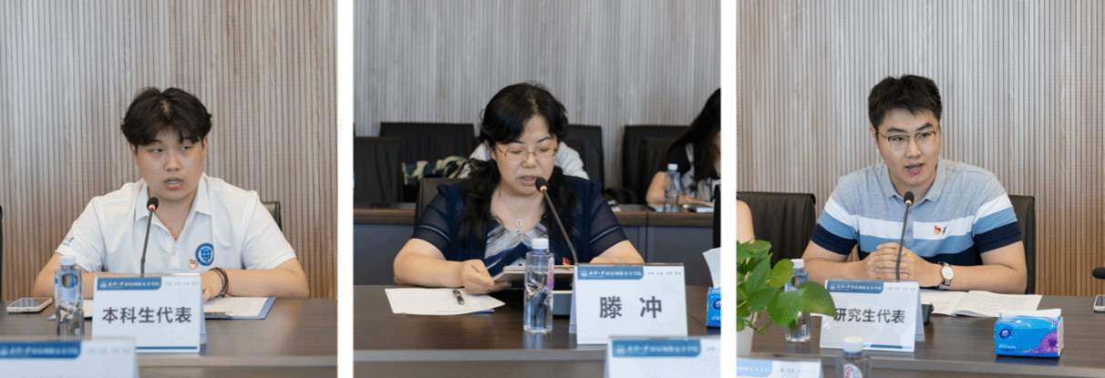 与会师生结合工作和学习实际交流了学习心得,并汇报了近期各支部开展党纪学习教育的情况。网络空间安全系党支部书记滕冲老师讲到,作为一名网信事业工作者和教师要以身作则,在学生培养、师德师风建设、学术交流、科研合作等方面贯彻纪律意识,努力践行为党育人、为国育才。网络法学专业的硕士徐云骞讲到,作为未来的网络法律工作者,要时刻保持高度的政治敏锐性和法律专业性,将党的纪律要求融入网络法学的研究与实践中,维护良好网络秩序、促进网络空间健康发展。本科生第二党支部杨皓迪汇报了支部党纪学习教育开展情况,压实理论学习、创新学习形式、注重实践研学,努力做到学思用贯通、知信行统一,确保了学习教育成效。